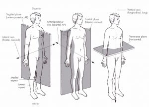 Frontal (coronal) plane: runs laterally, divides body into front and back.